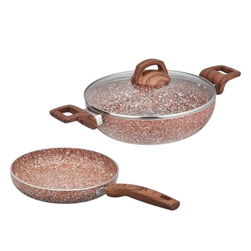- COLOUR: Rust Granito; PACKAGE CONTENTS: 1 fry pan (24 cm), 1 deep kadai with glass lid (24 cm); Thickness: 3.5 mm