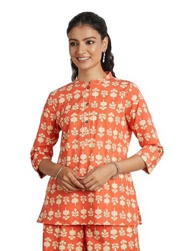 - PRODUCT DETAILS: Regular fit, screen printed, short kurti featuring band collar with half placket and 3/4th sleeves with roll tab cuff.