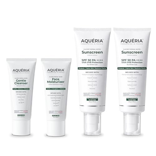 Aquéria French Skincare Kit (Pack of 4) for Acne-Prone, Oily & Combination Skin | Oil Control Brightening French Sunscreen SPF 50 (50g x 2) | 5% Niacinamide & Ceramides Face Wash (20ml) | Oil-Free Gel Moisturizer (15g) | Fragrance-Free, Lightweight, Non-Greasy, No White Cast, Dermatologist Validated is available on Amazon at best discounted online price. Original price of this product is ₹ 1598. You can buy this product at discounted rate ₹ 349.