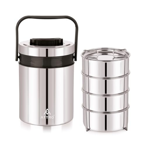 ATTRO Steel On 4 Insulated Tiffin Box 4 Stainless Steel Containers Easy Carry Handle, BPA-Free, Leakproof Office, School & Travel Grey, 1200 ml is available on Amazon at best discounted online price. Original price of this product is ₹ 1699. You can buy this product at discounted rate ₹ 899.