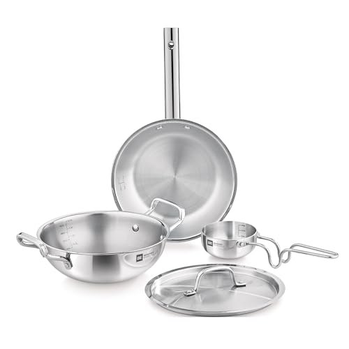 Bergner TriPro Tri-Ply Stainless Steel 4 Pcs Cookware Set – 22cm Indian Wok/Kadai with Lid, 22cm Frypan, 10cm Tadka Pan, Even Heating, Less Oil Use, Healthy Cooking – Induction and Gas Stove Ready