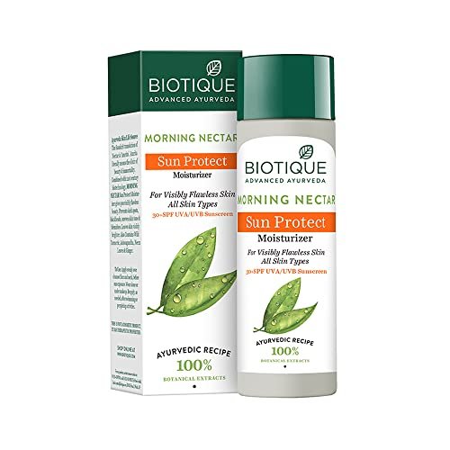 Biotique Morning Nectar Sun Protect Moisturizer SPF 30 UVA/UVB Sunscreen| Contains Wild Turmeric, Neem Leaves, & Morning Nectar | Visibly Flawless Skin | Suitable for All Skin Types | 120 ml is available on Amazon at best discounted online price. Original price of this product is ₹ 299. You can buy this product at discounted rate ₹ 127.