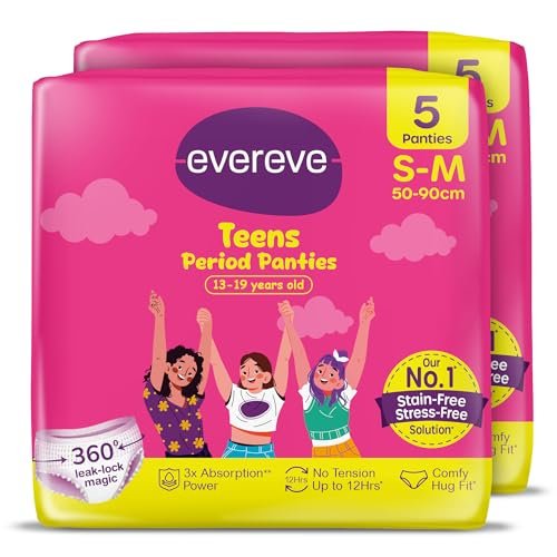 Evereve Teens Period Panties, S-M, 5Pcs Pack of 2 (for 13-19 yrs old), 360° Anti-Leak Protection, up to 12hrs Absorbency, Heavy Flow Care, Ideal for School & Overnight Use, Comfy Hug Fit is available on Amazon at best discounted online price. Original price of this product is ₹ 274. You can buy this product at discounted rate ₹ 199.