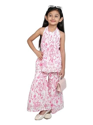 GORLYA Girls Cotton Peplum Kurta Sharara Set | White & Pink Sleeveless Halter Neck Ethnic Co-Ord | Printed Festival Outfit for Kids | Wedding, Party, Diwali, Christmas, New Year, Summer Look