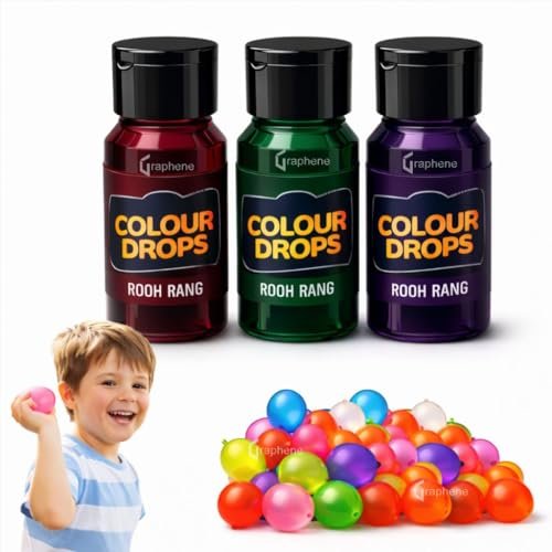 GRAPHENE Holi Color Non Toxic Liquid Colour Drops, Rooh Rang, Pack of 3, 25 ml Each, with 100 Water Balloons For Kids Eco-Friendly Non Toxic Quick Fill Easy Tie Gulal Water for Boys Girls is available on Amazon at best discounted online price. Original price of this product is ₹ 1299. You can buy this product at discounted rate ₹ 419.