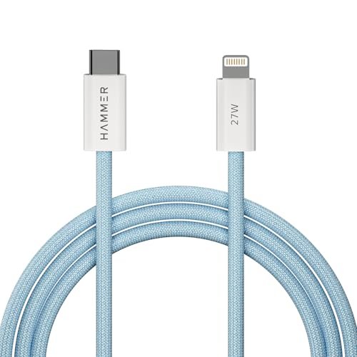HAMMER 27W Type-C to Lightning 8 Pin Nylon Braided Cable, 27W Fast Charging, 480Mbps High Speed Data Transfer & Durable Tangle Free Design, Compatible with iPhone, iPad, iMac, AirPods, 1.2M (Blue) is available on Amazon at best discounted online price. Original price of this product is ₹ 999. You can buy this product at discounted rate ₹ 229.