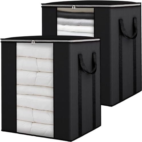 HOLLIO Extra Large Clothes Storage Organizer with Reinforced Handle transparent blanket storage bag saree bag/lehnga/winter clothes, pillow storage and wardrobe organizing (PACK OF 2, Black)