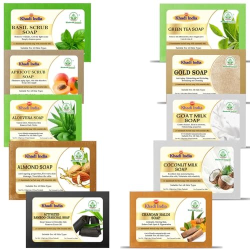 • VARIETY PACK: Set of 10 premium bathing soaps including Basil Scrub, Apricot Scrub, Aloevera,Almond, Goat Milk, Activated Bamboo Charcoal, Green Tea, Gold Soap,Coconut Milk And Chandan Haldi variants for complete skincare needs