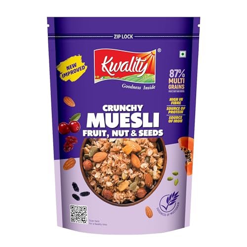 Kwality Muesli – Fruit, Nuts & Seeds Blend, 750 g | 87% Multi grains | High‑Fibre, Protein‑Rich Multigrain Breakfast Cereal with Almonds, Raisins, Cranberries, Pumpkin & Flax Seeds, No Preservatives is available on Amazon at best discounted online price. Original price of this product is ₹ 525. You can buy this product at discounted rate ₹ 263.