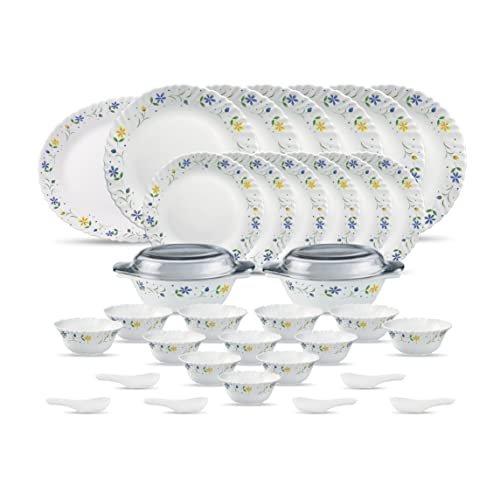 La Opala Diva Classique Collection Opal Glass Crockery | for Family of 6 | Dinner Set 35 pcs Twilight Bouquet | Plates & Bowls for Dining | Microwave Safe | 100% Vegetarian | Extra Strong | White