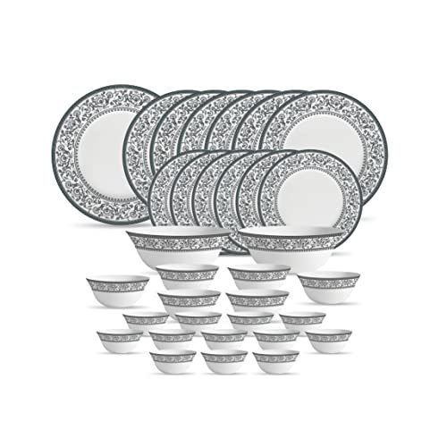 La Opala Diva Sovrana Collection Opal Glass Crockery | for Family of 6 | Dinner Set 33 pcs Persian Grey | Plates & Bowls for Dining | Microwave Safe | 100% Vegetarian | Extra Strong | Light & White