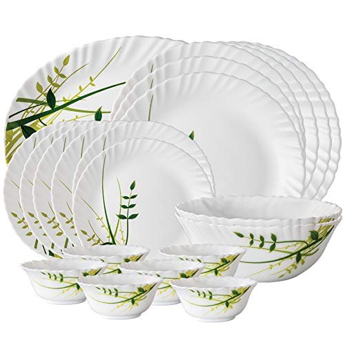 - Color: White, Material: Opalware.Package Contents: 6-Piece Full Plate (27cm), 6-Piece Qaurter Plate (18cm), 6-Piece Veg Bowl (11.5cm), 2-Piece Serving Bowl (2.5 cm) and 1-Piece Rice Plate (33cmx25cm).