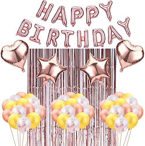 - 【Package Included】Our Balloon Party Decorations Set including 15 Pcs Rose Gold Balloons ,15 pcs Gold Balloons, 15 pcs Rose gold confetti Balloons,2 pcs Rose gold Heart foil Balloons, 2 pcs Rose gold Star foil Balloons, 1 pc Rose gold Foil Fringe Curtain, 1 set of Rose gold Happy Birthday foil Balloons, 1 pcs inflating straw.