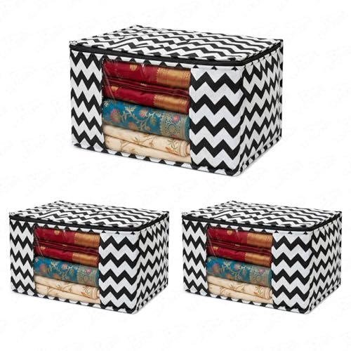 Lukzer Non-Woven Zigzag Printed Saree Covers for Storage with Transparent Window & Zip | Large Cloth Storage/Wardrobe Organizer for Woman Clothes/Lehengas/Dresses 45x33x20CM – Set of 3 (SRC-02-03)