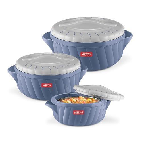 MILTON Flora Regular Set Insulated Inner Steel Casserole for Roti 3Pc (750ml 1.25L & 2.1L) Hot Box for Kitchen, Hot Pot with Lid, Chapati Box, Roti Casserole, Serving Boxes, Hotcase, Stone Bue is available on Amazon at best discounted online price. Original price of this product is ₹ 1570. You can buy this product at discounted rate ₹ 824.72.