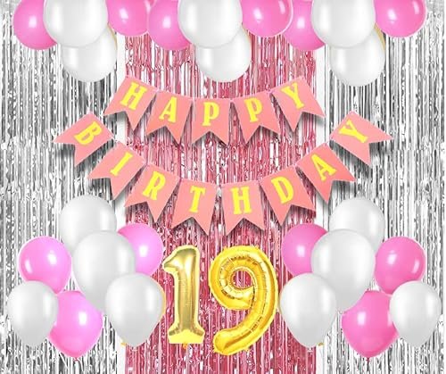 Mystic Toy Store 19th Birthday Decoration Items for Girls With Pink and White Balloons, Happy Birthday Banner, Silver Foil Curtain, Foil Balloon Number 19