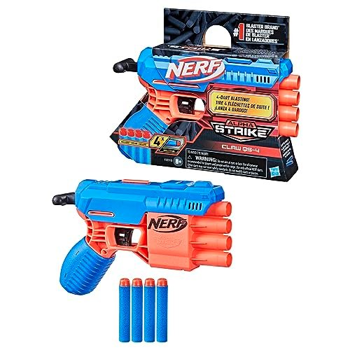 - START BLASTING WITH NERF ALPHA STRIKE BLASTERS: Alpha Strike blasters are a great way to start experiencing the power, performance, and excitement of Nerf, the number one blaster brand* CLAW QS-4 BLASTER: Load, prime, and fire in 3 quick steps to unleash 4-dart blasting from this Alpha Strike blaster that’s powered by you — no batteries required INCLUDES 4 OFFICIAL NERF ELITE DARTS: Includes 4 Official Nerf Elite foam darts that are tested and approved for performance and quality