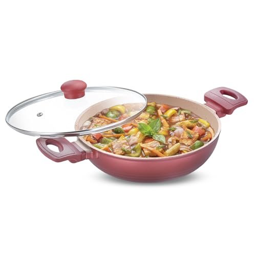 Prestige 24cm/2.4 Litre Omega Die-Cast Non-Stick Kadai with Glass Lid | 3-Layer Coating | Die-Cast Body | Metal Spoon Friendly | Heavy Base | Pink