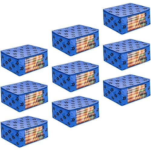 PrettyKrafts Pack of 9 Non Woven Large Flower Prints Saree Cover/Wardrobe Organizer With Transparent Window And Zip/Clothes Storage Bag For Women's Lehenga, Suit Saree & Other Accessories, Blue