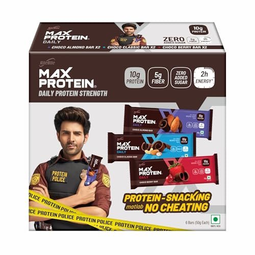 • DELICIOUS NUTRITION: You deserve a special treat, satisfy your taste buds with this Variety Pack of Protein bars loaded with protein & fiber giving you quick and sustained energy. MADE IN INDIA : Max Protein is the first brand to launch nutrition & protein bars in India. We have created and nurtured protein bars category in Indian Market.