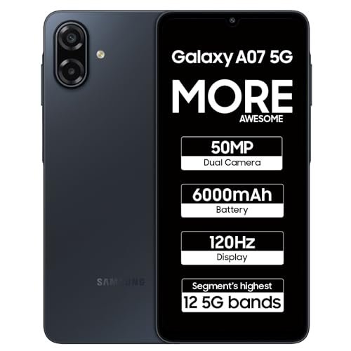 Samsung Galaxy A07 5G Smartphone (Black, 6GB RAM, 128GB Storage) | 120Hz Refresh Rate | Massive 6000mAh Battery | 50MP True Dual Camera | 6 Gen OS Upgrades | Knox Vault is available on Amazon at best discounted online price. Original price of this product is ₹ 21499. You can buy this product at discounted rate ₹ 17999.