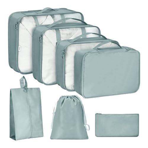 - 7 Piece Travel Packing Cubes Set : Includes 3 different size packing cubes for clothes, 3 multipurpose laundry and toiletry pouches, and 1 drawstring shoe bag to keep your luggage neatly organized during travel.