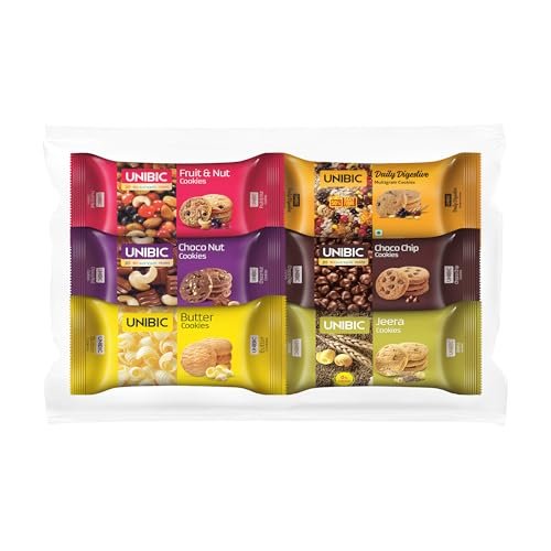 Unibic, Assorted (Pack Of 6 X 75 G/ 67.5G) | Biscuits Combo Pack | Choco Chip | Butter | Fruit & Nut | Honey Oatmeal I Jeera | Cashew | 450g / 405g Weight may Vary is available on Amazon at best discounted online price. Original price of this product is ₹ 200. You can buy this product at discounted rate ₹ 128.