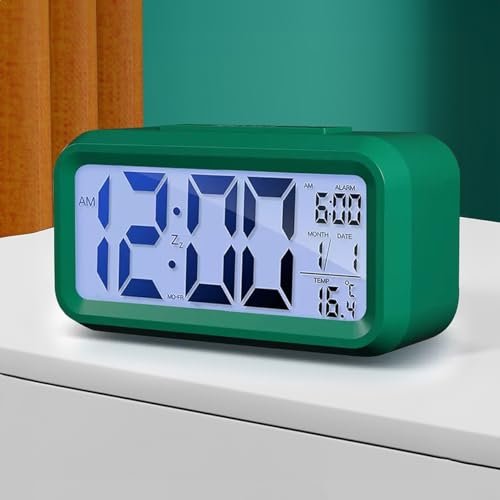 • Wolpin Digital Alarm Clock Desk Clock with Time, Date, Indoor Temperature, Smart Night Light LCD Display for Home, Kids Study, Office, Bedroom – Battery-Operated, Green