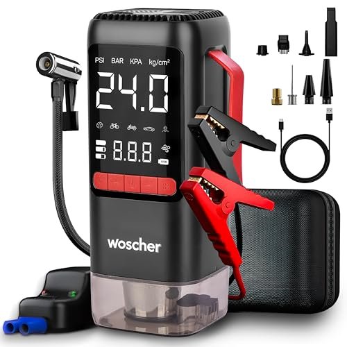 • 6-IN-1 BATTERY JUMP STARTER FOR CAR: Woscher BoostMax is a powerful portable jump starter combined with a digital tyre inflator, vacuum cleaner, LED light, and power backup—designed for emergency car starting and everyday travel needs.