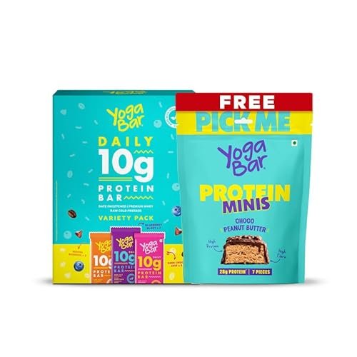 Yogabar 10g Protein Bars Variety Pack of 6 (2x Blueberry Blast, 2x Mocha Brownie, 2x Dark Chocolate Chip) + 7x 4g Protein Minis (Free) | Zero Added Sugar | Low Net Carbs | Whey, Peanut & Soy Protein Blend | Healthy Snack Bars is available on Amazon at best discounted online price. Original price of this product is ₹ 574. You can buy this product at discounted rate ₹ 370.